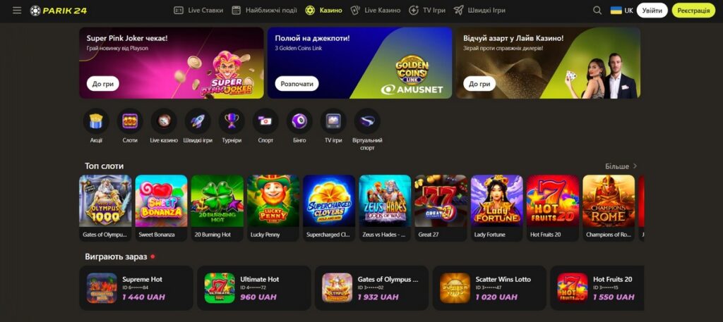 Parik24 — популярное онлайн казино Украины с 18 лет со ставками на спорт. Компания активно работает с украинской аудиторией с 2023 года. Платформа имеет международную лицензию Кюрасао и предлагает более 4000 разнообразных автоматов, включая блэкджек, покер, баккара, рулетку и живые игры с реальными дилерами. Ценители беттинга могут рассчитывать на объемную роспись линии, выгодные коэффициенты, прямые трансляции и статистику.