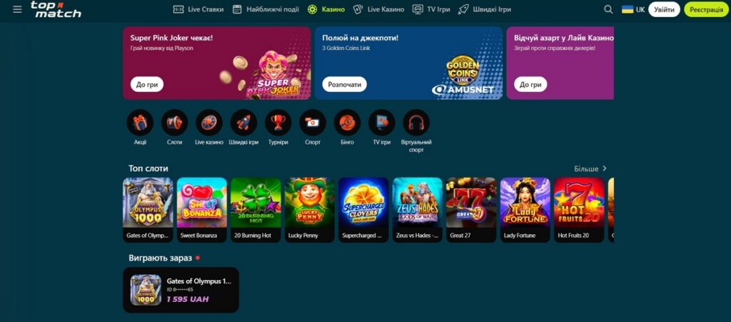 Topmatch — универсальная игровая платформа, которая объединяет онлайн казино и ставки на спорт от 18 лет. Имеет лицензию и пользуется большой популярностью среди украинцев благодаря богатому ассортименту азартных развлечений. Портал адаптирован под современный дизайн, имеет надежные системы шифрования и обеспечивает клиентам полную анонимность — есть платежи в криптовалюте.